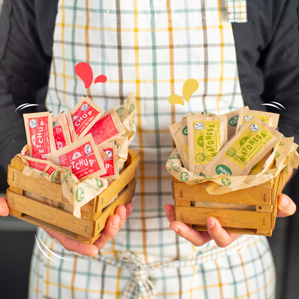 Al igual que muchas otras empresas, en búsqueda de eliminar los plásticos y apostar por envases sostenibles se ha creado un sobre de papel para sus diferentes salsas.