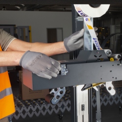Precintadora de cajas semiautomática de ajuste aleatorio Nastro-SB R de SIAT, se ajusta a diferentes tamaños de caja.